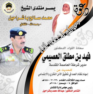 يقيم المنتدى الثقافي للشيخ / محمد صالح باشراحيل – ( يرحمه الله ) – لقاء تعريفيا عن دور عمدة الحي حيث يستضيف المنتدى سعادة اللواء / فهد بن مطلق العصيمي – ( مدير شرطة العاصمة المقدسة ) – للحديث عن :- ( إسهام نظام العمد في تحقيق الأمن الفكري و الإجتماعي ) – وفي حضور نخبة من عمد الأحياء بمكة المكرمة