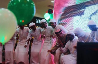 وبدأ الأحتفال عند الساعة ٧:٠٠ بمجموعة من الفعاليات والأنشطة المتنوعة، والتي كانت تعبر عن سعاده القيادة والشعب السعودي بهذه المناسبة السعيده وتقدم التهاني والتبريكات إلى قيادة وشعب الإمارات متمنين لهم دوام العزّ والأمان .