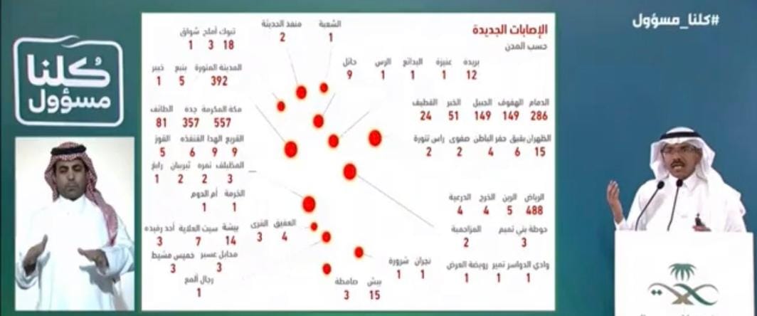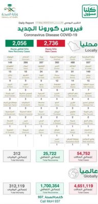 أعلن المتحدث الرسمي باسم وزارة الصحة الدكتور محمد العبدالعالي عن رصد 2736 حالة جديدة بفيروس كورونا المستجد في المملكة.