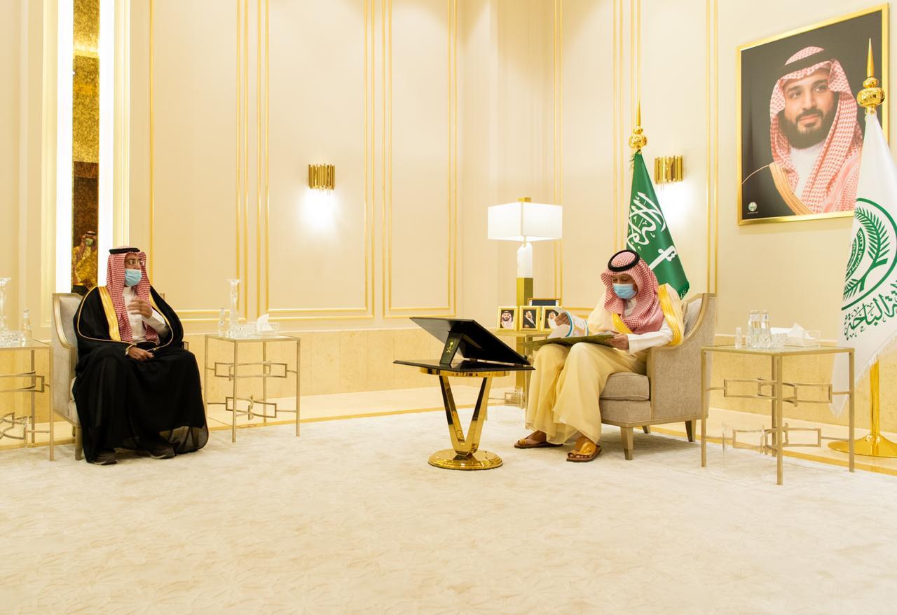 وفي بداية الاستقبال رحب سمو أمير المنطقة بالقرني ومرافقيه متمنيا لهم التوفيق.