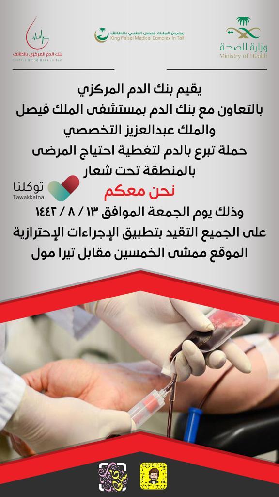 يدعوكم بنك الدم المركزي بالتعاون مع بنك الدم بمستشفى الملك فيصل ومستشفى الملك عبدالعزيز التخصصي حملة التبرع بالدم لتغطية احتياج المرضى بالمنطقة تحت شعار “نحن معكم ” .