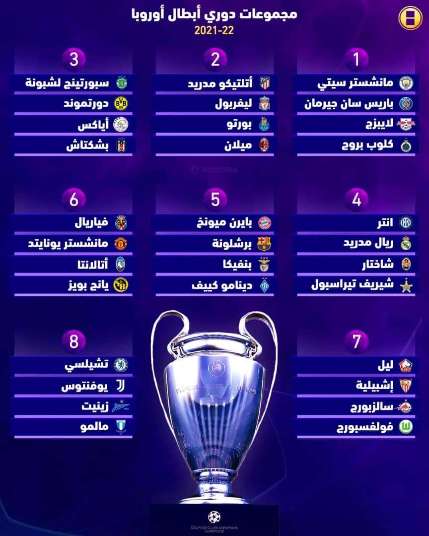 أسفرت قرعة دور المجموعات لدوري أبطال أوروبا لموسم (2021-2022)، التي أجريت مساء اليوم ، في مدينة إسطنبول التركية، عن مواجهات نارية في العديد من المجموعات.