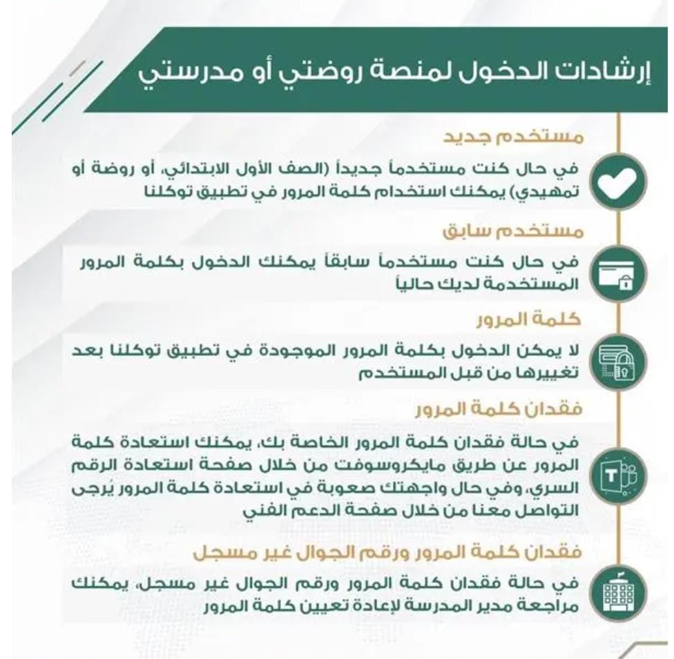 ودعت الوزارة من يواجه صعوبة في استعادة كلمة المرور إلى التواصل معها عبر صفحة الدعم الفني، أما إذا فقد الطالب كلمة المرور، ولم يكن رقم الجوال مسجلاً، فعليه مراجعة مدير المدرسة لإعادة تعيينها.