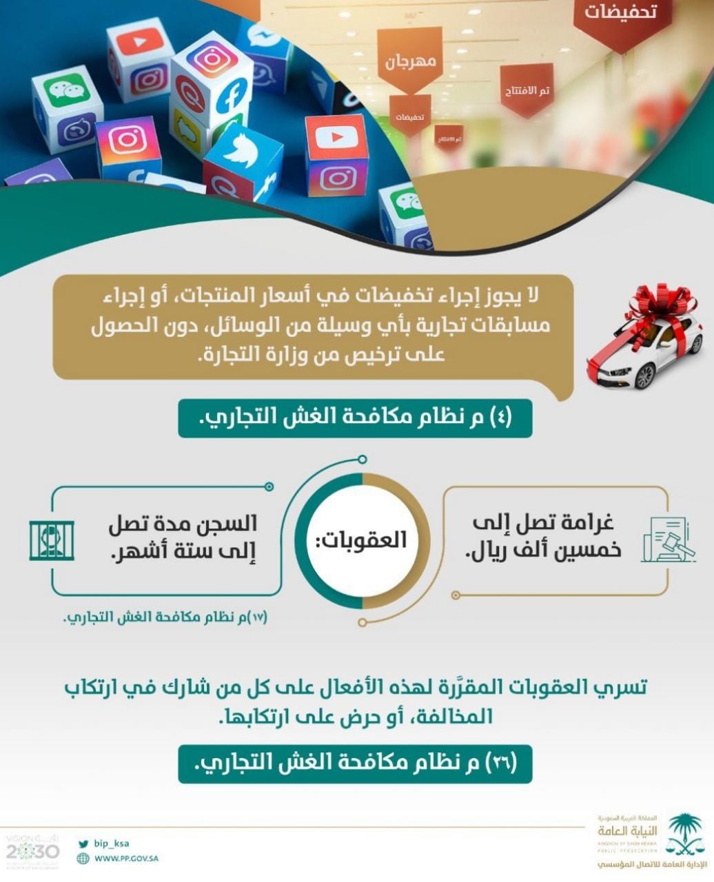 وقالت النيابة عبر حسابها في “تويتر” أن ذلك يسري أيضا على الدعاية أو الإعلان في هذا الشأن بأي وسيلة من الوسائل، سواء بطريق مباشر أو غير مباشر، طبقا لنظام مكافحة الغش التجاري.