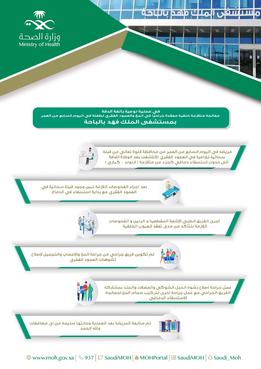 أجرى الفريق الطبي المختص بمستشفى الملك فهد عملية نوعية بالغة الدقة لمريضة في اليوم السابع من العمر من مواليد قلوة حيث تبين بعد إجراء الفحوصات اللازمة أنها تعاني من قيلة سحائية نخاعية في العمود الفقري اكتشفت بعد الولادة اضافة الى حدوث استسقاء دماغي كجزء من متلازمة (أرنولد-كياري)وقد أجرى الفريق الطبي الأشعة المقطعية والرنين للتأكد من مدى تعقد العيوب الخلقية وتم تكوين فريق جراحي من جراحة المخ والأعصاب والتجميل لإصلاح تشوهات العمود الفقري وقد تم عمل جراحة اصلاح تشوه الحبل الشوكي والعضلات والجلد بمشاركة الفريق الجراحي وأيضًا تم عمل جراحة أخرى لتركيب صمام المخ لمعالجة الإستسقاء الدماغي وتمت متابعة المريضة بعد العملية وحالتها سليمة من اي مضاعفات ولله الحمد.