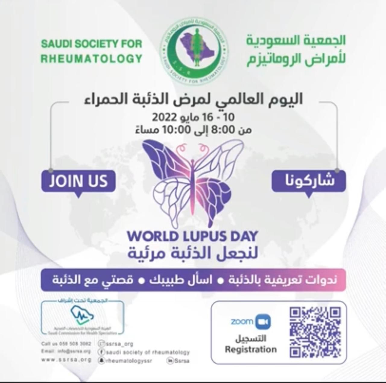 الجمعية السعودية لأمراض الروماتيزم تشارك في الاحتفاء باليوم العالمي بالعديد من المحاضرات والندوات التوعوية المجانية على منصة زووم و استقرام الجمعية يحيي العالم في العاشر من مايو من كل عام اليوم العالمي للذئبة الحمراء، إذ تخصص المنظمات العالمية الصحية أنشطة للتعريف بمرض الذئبة الحمراء لزيادة الوعي وتثقيف الناس حول الأعراض والآثار الصحية لهذا المرض.