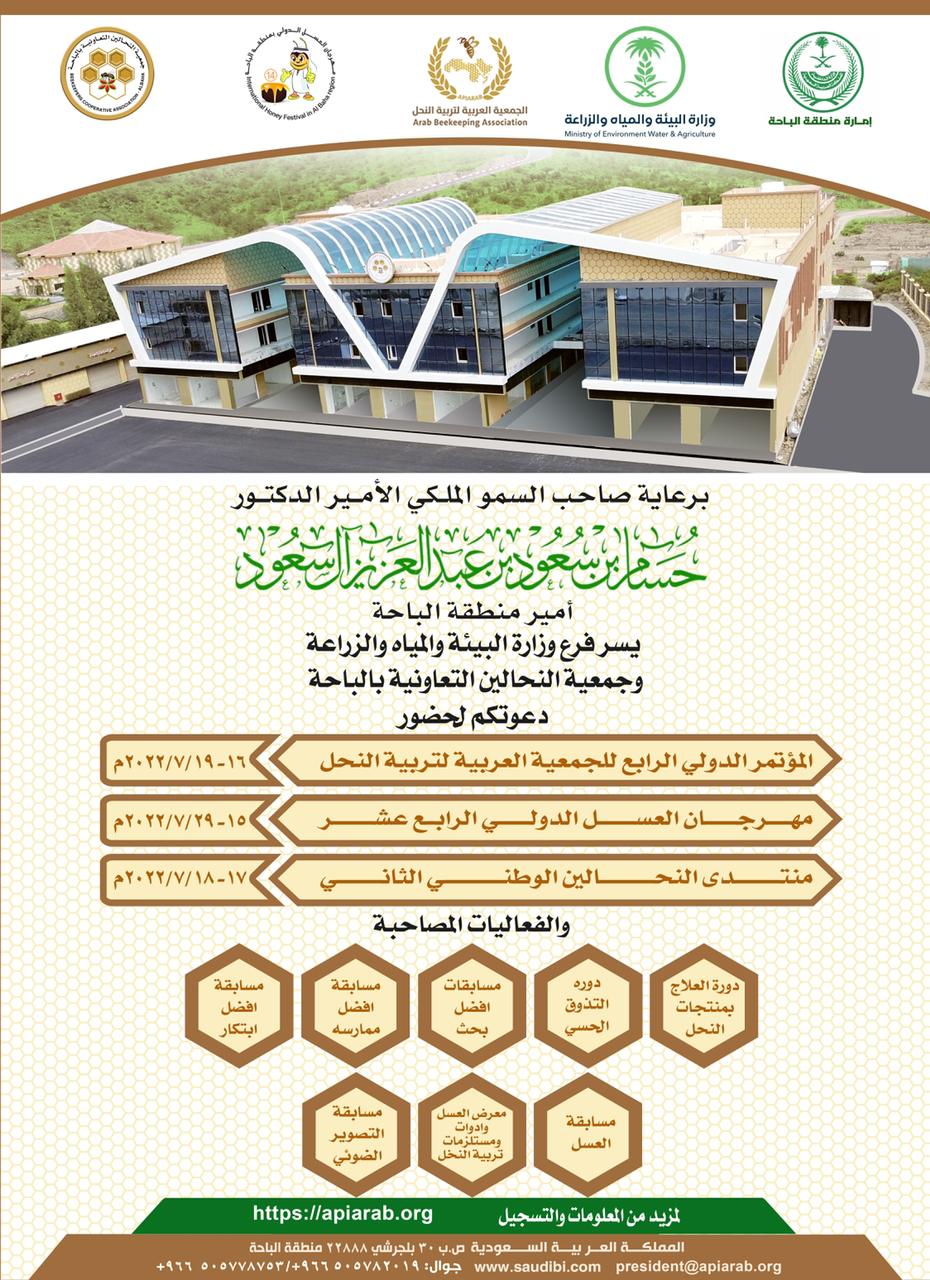 باحة النحل والعسل تحتضن خبراء العالم مطلقةً فعاليات دولية بطعم العسل، في منتصف شهر ذي الحجة القادم وتستمر لمدة 15 يوماً. إذ الجميع في منطقة الباحة في حالة استنفار للتجهيز والإعداد لاستضافة المؤتمر الدولي الرابع لتربية النحل، ومهرجان العسل الدولي الرابع عشر، ومنتدى النحالين الوطني الثاني، وتأتي هذه الفعاليات الدولية الفريدة من نوعها برعاية أمير المنطقة الأمير الدكتور حسام بن سعود بن عبدالعزيز، وبإشراف امارة منطقة الباحة وبتنظيم جمعية النحالين التعاونية بالباحة وفرع وزارة البيئة والمياه والزراعة.