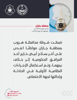 ضبطت شرطة محافظة هروب بمنطقة جازان مواطناً اعتدى على آخر بسلاح أبيض خارج حدود المرافق الحكوميه إثر خلاف بينهما . وتم استكمال الاجراءات النظاميه الأوليه في الحادثه وإحالتها لجهة الإختصاص .