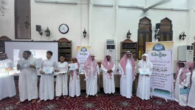 وفي نهاية الحفل قام سعادة نائب رئيس الجمعية الشيخ عادل عيد النزاوي وعضو مجلس إدارة الجمعية الأستاذ محمد فراج بخيت وإمام الجامع الكبير الشيخ الدكتور ماجد حميد العلوني بتكريم الطلاب الحافظين لكتاب الله عز وجل والطلاب الناجحين .