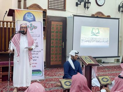 وقام الطلبة بتقديم نماذج من التلاوات من القرآن الكريم ثم كلمة نائب رئيس الجمعية الشيخ عادل بن عيد النزاوي رحب فيها بالحضور المبارك ودعا الله سبحانه وتعالى أن ينفع بحفظة كتاب الله – المسلمين – في كل مكان ومبينا أهمية حفظ القرءان الكريم وتدبر آياته وفهم معانيه ومقدما شكره لرئيس مجلس إدارة الجمعية الشيخ الدكتور سلامة بن سليم الرفاعي على دعمه ومساندته الدائمة لكافة أنشطة الجمعية وحفظة كتاب الله الكريم – والقائمين – على هذا الصرح الإسلامي العظيم .