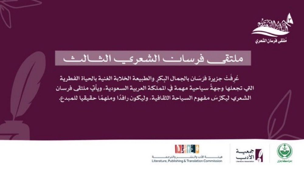 تحتضن محافظة جزر فرسان بعد غدٍ الجمعة، فعاليات “الملتقى الشعري السنوي الثالث”، الذي تقيمه جمعية الأدب المهنية، وذلك في الحديقة المائية بشاطئ الغدير.