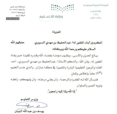أشاد معالي وزير التعليم الأستاذ يوسف بن عبدالله البنيان بالمهام والأعمال المميزة التي قام بها رئيس قسم الاختبارات بالإدارة العامة للتعليم في منطقة جازان سابقاً الأستاذ عبدالحفيظ بن مهدي السروري، – رحمه الله – من خلال خدمة ٤٣ عاماً قضاها في مجال التعليم تميزت بالإخلاص والتفاني،