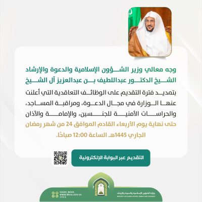وجه معالي وزير الشؤون الإسلامية والدعوة والإرشاد الشيخ الدكتور عبداللطيف بن عبدالعزيز آل الشيخ بتمديد فترة التقديم على الوظائف التعاقدية التي أعلنت عنها الوزارة في مجال الدعوة، ومراقبة المساجد، والحراسات الأمنية للجنسين، والإمامة والأذان، حتى نهاية يوم الأربعاء القادم الموافق 24 من شهر رمضان الجاري 1445هـ الساعة 12:00 صباحًا.