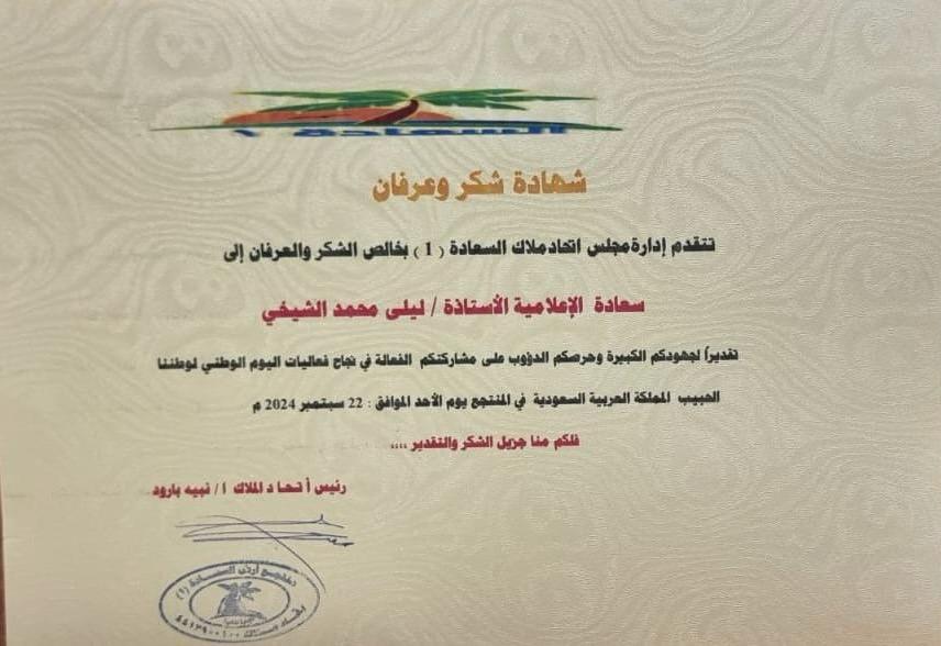 الأعلامية الأستاذة ليلى الشيخي شهادة شكر وتقدير من إدارة مجلس أتحاد ملاك السعادة (1) وذلك نظير جهودها المُثمرة وعطائها المُتميز بالمساهمة في أنجاح فعاليات الأحتفال باليوم الوطني السعودي 94 من جهَتهَا رفعّت الأستاذة ليلى الشيخي شكرّهَا وعظيّم أمتنانهَا لرئيس أتحاد ملاك السعادة الأستاذ نبية بارود قائلة أن هذا التكرّيم حافّز لتقديّم المزيد من العطاء لخدمة الوطن الحبيب وقيادتنا الحكيمْة