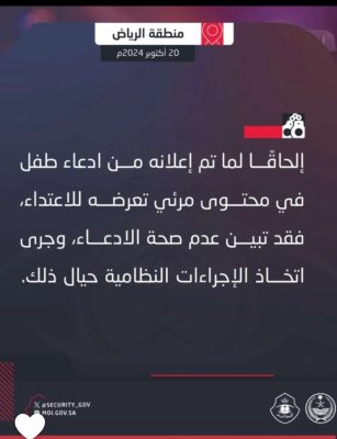 وأوضحت أنه إلحاقاً لما تم إعلانه من ادعاء الطفل في محتوى مرئي تعرضه للاعتداء فقد تبين عدم صحة ذلك، وجرى اتخاذ الإجراءات النظامية حيال ذلك.