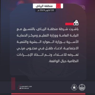 وكانت شرطة المنطقة قد باشرت بالتنسيق مع النيابة العامة ووزارة التعليم ومركز الحماية الأسرية بوزارة الموارد البشرية والتنمية الاجتماعية، ادعاء الطفل تعرضه للاعتداء.