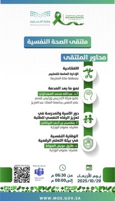 وقد عُقد الملتقى عن بُعد عبر منصة Microsoft Teams، بمشاركة عدد من القيادات التعليمية والمشرفين والمشرفات والمعلمين والمعلمات والمهتمين بالصحة النفسية، وذلك من الساعة 6:30 مساءً حتى 8:00 مساءً. ويأتي هذا الملتقى ضمن جهود وزارة التعليم المستمرة في نشر ثقافة الوعي النفسي، وتعزيز بيئة تعليمية آمنة وصحية تسهم في دعم الطلبة نفسيًا وتعليميًا