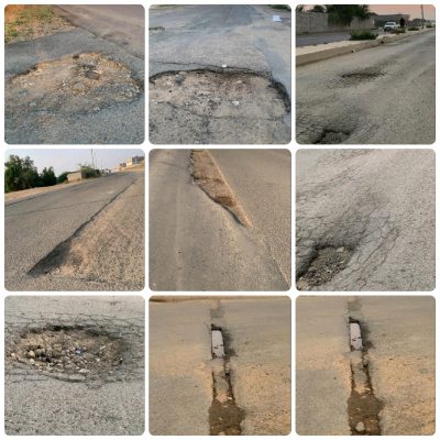 وطالب الأهالي بالوقوف العاجل على متطلبات الخدمات البلدية بالمحافظة وإعادة النظر في الكثير من شوارع المحافظة، بعد أن أصبحوا يعانون من الحفر والتشققات؛ فالحفر التي تتوسط الشوارع تشكل خطراً على السائقين من الحوادث، بالإضافة لتسببها في إتلاف السيارات، وقد تؤدي إلى حوادث تذهب ضحيتها أنفس أو إصابات، متسائلين عن دور أمانة منطقة وما هو الوقت الذي تحتاجه أمانة المنطقة لتحديد مواقع الحفر والتشققات ومساحة تلك الحفر.