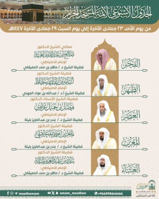 ويأتي اعتماد هذا الجدول في إطار تنظيم شؤون الإمامة بالمسجد الحرام والمسجد النبوي، بما يتيح للمصلين أداء عباداتهم في أجواء روحانية مفعمة بالطمأنينة، وبقيادة أئمةٍ من أهل العلم والخبرة