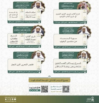 وأوضحت الرئاسة أن الجدول يتم بصفة شهرية كل بداية شهر هجري جديد وذلك عبر المنصات الإعلامية الرسمية للرئاسة ووكالة الشؤون العلمية والتوجيهية، حرصًا على تمكين القاصدين من متابعة هذه الدروس والاستفادة منها.