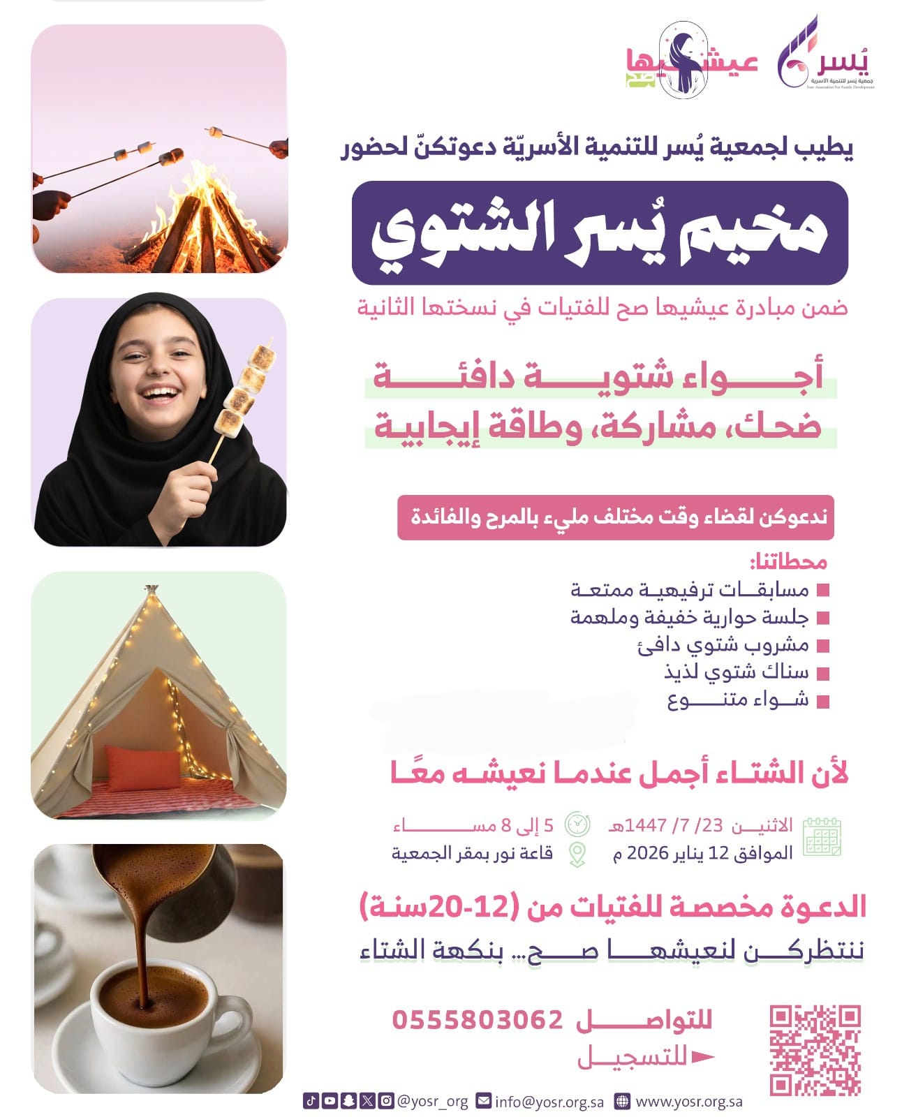 وتقام الفعاليات في قاعة نور بمقر جمعية يُسر للتنمية الأسرية بالحمراء